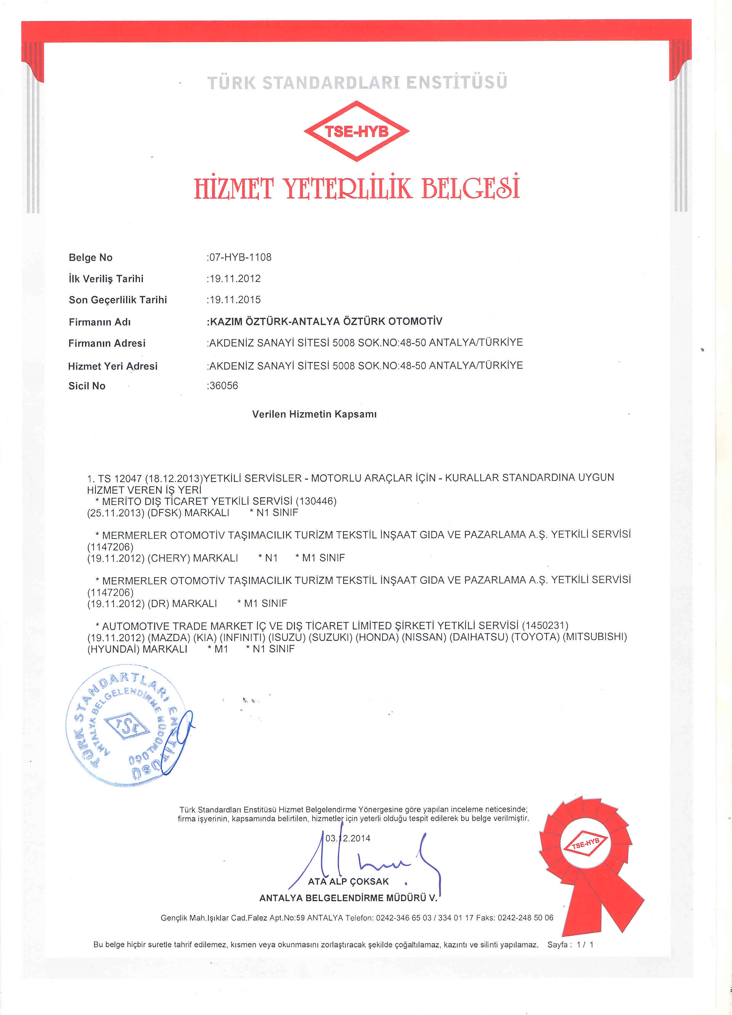Öztürk Otomotiv - Türk Standartları Enstitüsü Hizmet Yeterlilik Belgesi